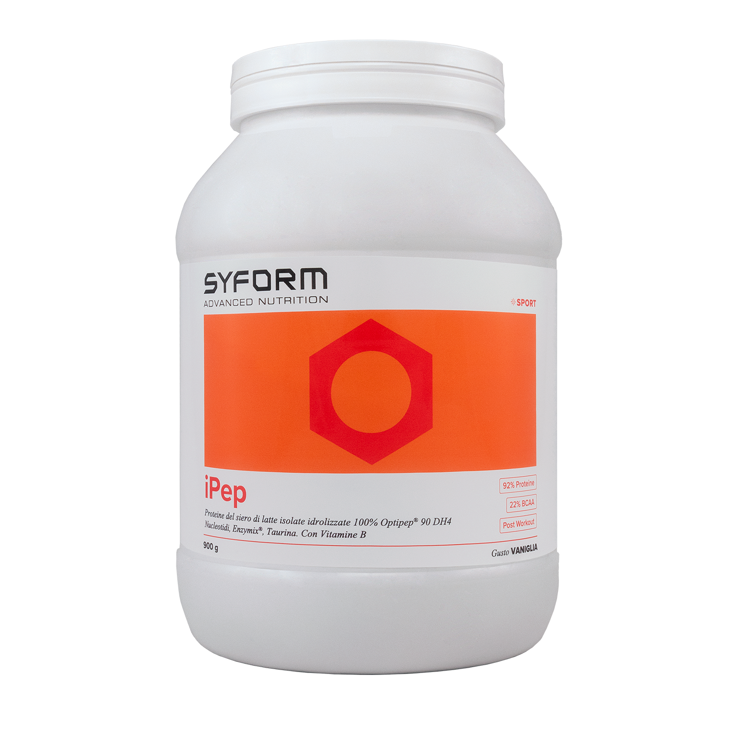 iPep is a food supplement based on a source of isolated, hydrolysed and instantized whey protein: OPTIPEP® 90 DH4, one of the most advanced, complete and qualitative sources of protein available on the market. Hydrolysis is a process which breaks down proteins into simpler molecular structures, peptides, made up of short chains of amino acids that are highly digestible and bioavailable in a very short time. Thanks to its features, iPep represents the top nutrition supplement for athletes. iPep contains 60-65% of amino acids as quickly digestible “di-tripeptides”, it provides 22% of BCAAs and protein of superior quality (biological value B.V.=104). In addition, it provides an important dosage of calcium and phosphorus. The new formula is enriched with nucleotides, the DNA bricks which, in certain physiological conditions such as intense stress, infections and sports activities, become semi-essential nutrients. Indeed, nucleotides facilitate the integrity of the intestinal barrier, have a prebiotic function, encourage the increase of intestinal immunoglobulins, and contribute to controlling cortisol. An important recent scientific study has confirmed the significant increase in insulin secretion induced after the assumption of Optipep®, which proves that its use is useful in the post-workout phase